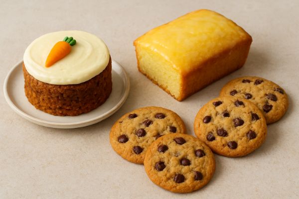 Contiene: 1 torta chica a elección (carrot cake, torta de chocolate o torta oreo), 1 budín a elección (chocolate, limón o naranja) y 4 cookies surtidas con infusión de te de regalo